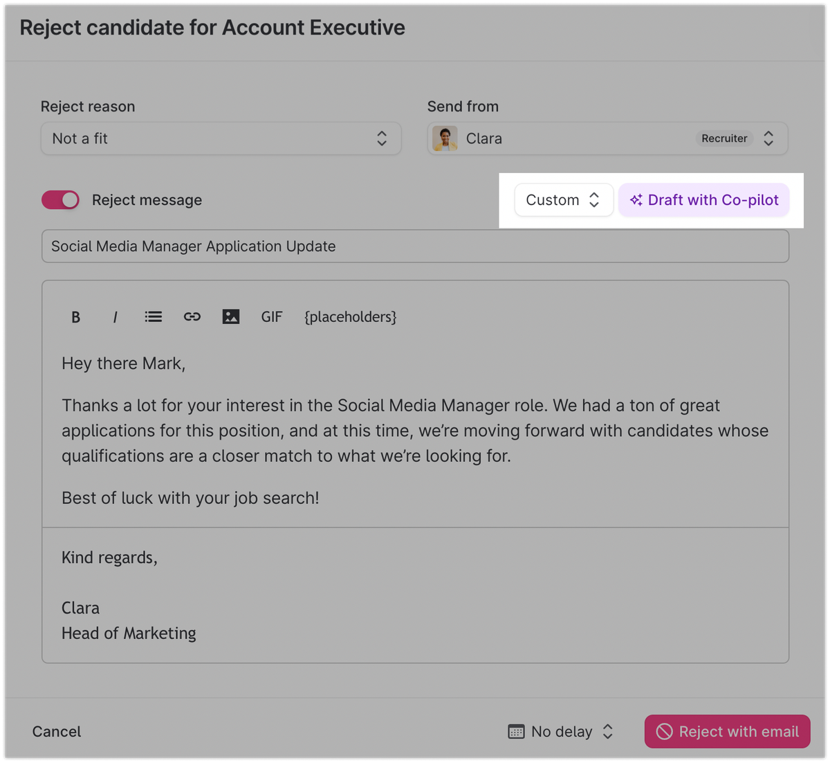 Istället för att skicka ett standardiserat meddelande om att en kandidat inte har gått vidare i processen så utgår Co-pilot från dina intervjuanteckningar och ger kandidaten personlig feedback om varför ni inte kommer att gå vidare med ansökan.