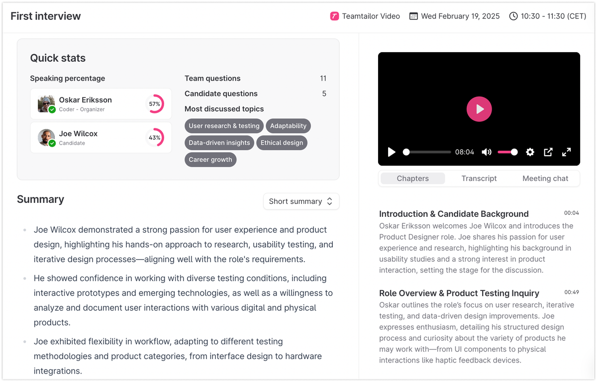 Efteråt får du tillgång till en transkription och statistik som bland annat visar hur mycket var och en pratar och vilka ämnen som diskuterats mest. Du kan också få en kort eller längre sammanfattning av intervjun. Transkriptionen är skriven på samma språk som användes under intervjun.